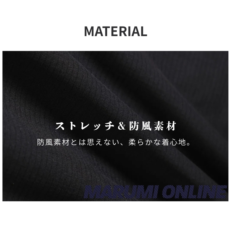 柔らかな素材を使用することで防風生地特有の不快なシャカシャカ音や生地のもたつきによる不快感を軽減させています。