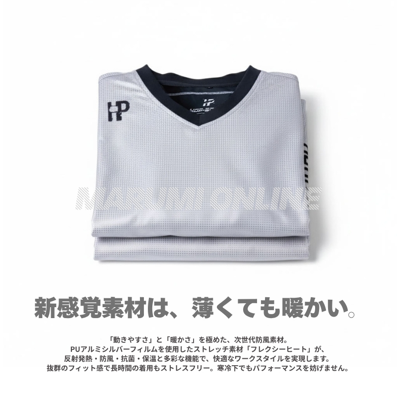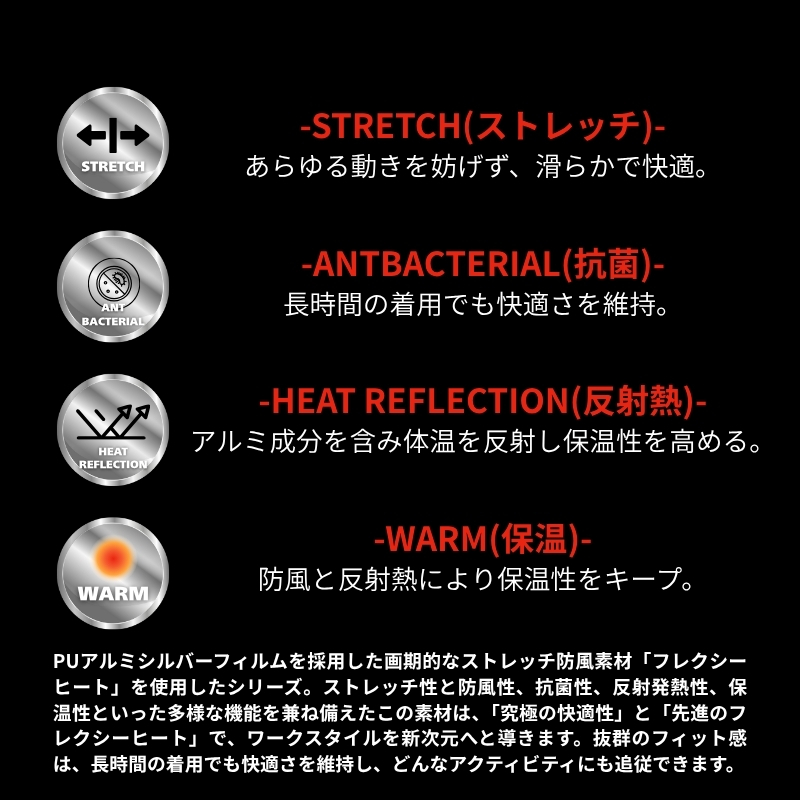 ストレッチ性・防風性・抗菌性・反射発熱性・保温性といった多彩な機能を兼ね備え、「究極の快適性」と「先進のフレクシーヒート」が、ワークスタイルを新次元へと導きます。