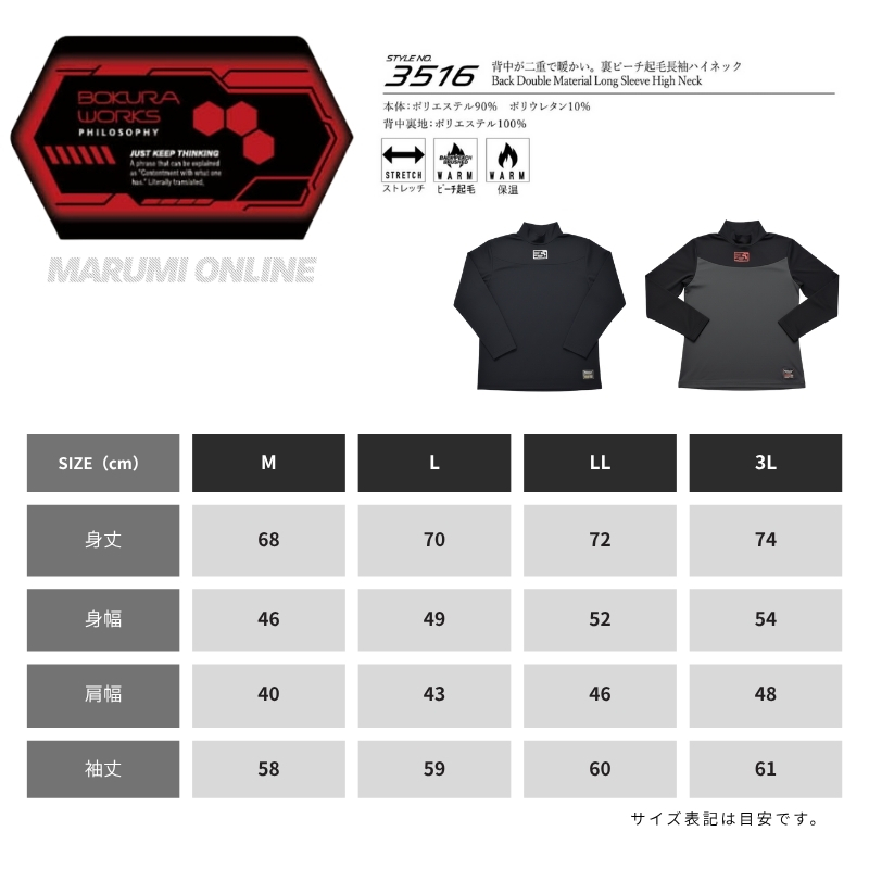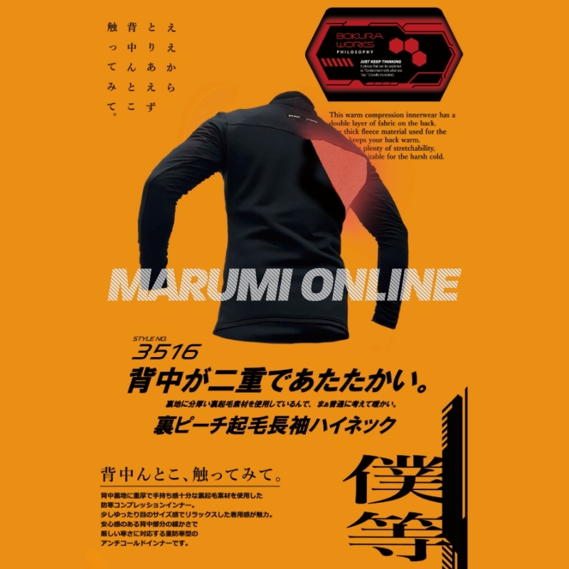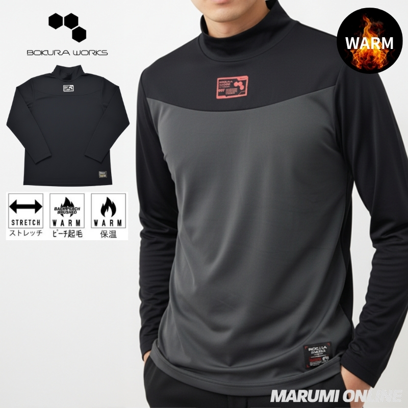 ボクラワークス 秋冬 防寒 インナー シャツ ハイネック 裏起毛 背中二重 暖かい ストレッチ スポーツ キャンプ 仕事 アウトドア [KN3516]