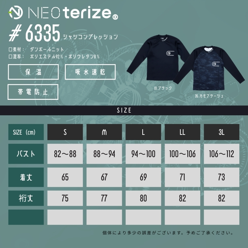 ネオテライズ おしゃれ かっこいい 作業着 作業服 秋冬 ストレッチ ダンボールニット 保温 コンプレッション インナー 6335 [NEO6335]