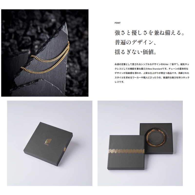 永遠の定番として愛されるシンプルなデザインのKiHei(“喜平”)。磁気ネックレスとしての機能を兼ね備えたNew Standardです。チェーンの基本的なデザインが高級感を漂わせ、上質な仕上がりが際立つ逸品です。洗練されたスタイルを求めるワーカーや職人にぴったりの、普遍的な魅力を持つネックレスです。