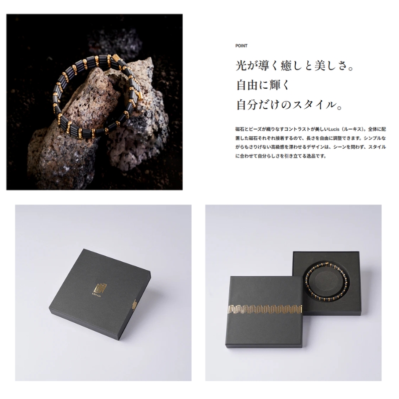 磁石とビーズが織りなすコントラストが美しいLucis(ルーキス)。全体に配置した磁石それぞれ接着するので、長さを自由に調整できます。シンプルながらもさりげない高級感を漂わせるデザインは、シーンを問わず、スタイルに合わせて自分らしさを引き立てる逸品です。