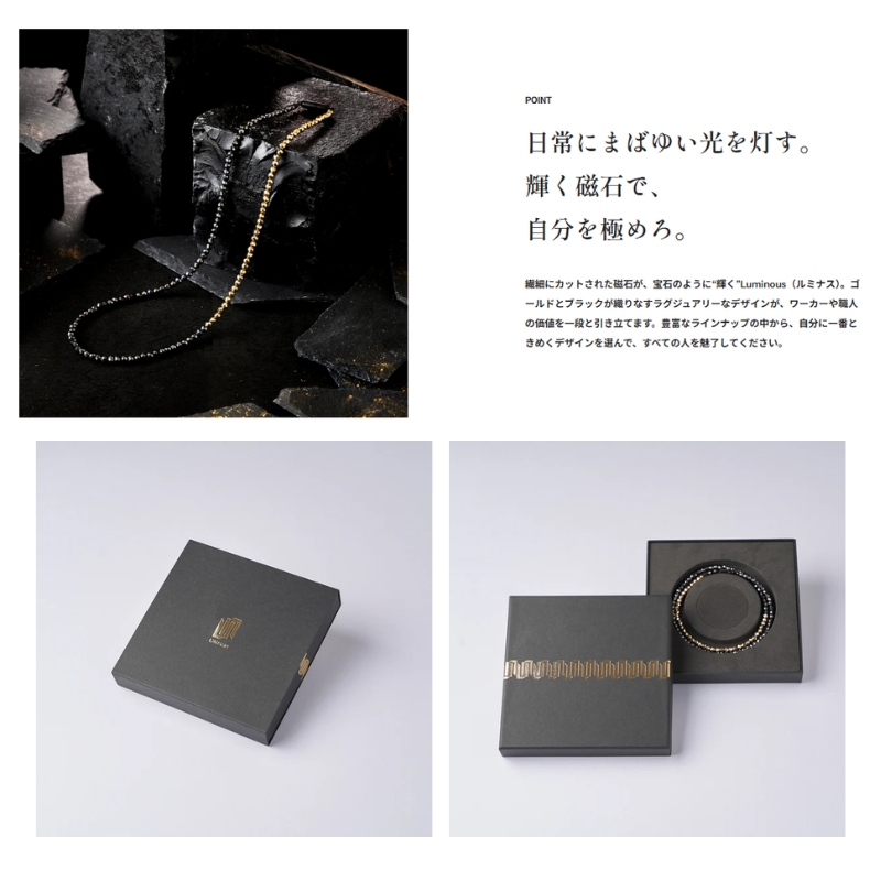 繊細にカットされた磁石が、宝石のように“輝く”Luminous(ルミナス)。ゴールドとブラックが織りなすラグジュアリーなデザインが、ワーカーや職人の価値を一段と引き立てます。豊富なラインナップの中から、自分に一番ときめくデザインを選んで、すべての人を魅了してください。
