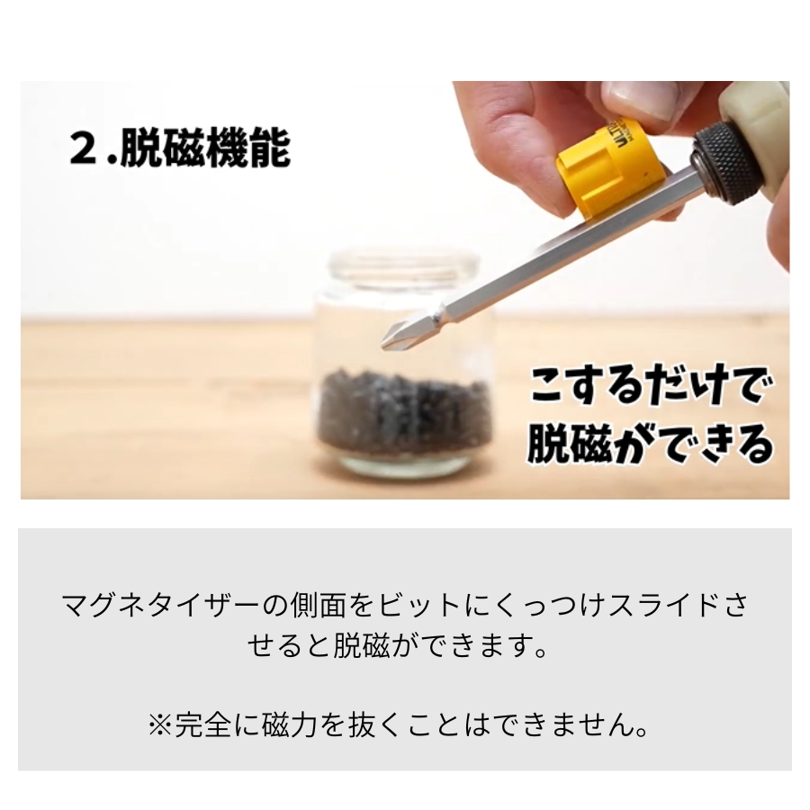 マグネタイザーの側面をビットにくっつけスライドさせると脱磁ができます。