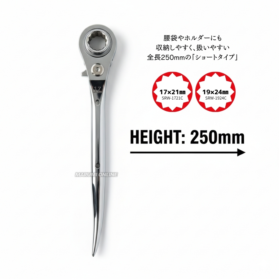 ラチェットレンチ 17mm 21mm 19mm 24mm 太い メッキ カッコいい ショートタイプ 八角グリップ 曲がり シノ マストツール イチネンアクセス SRW-1721C SRW-1924C