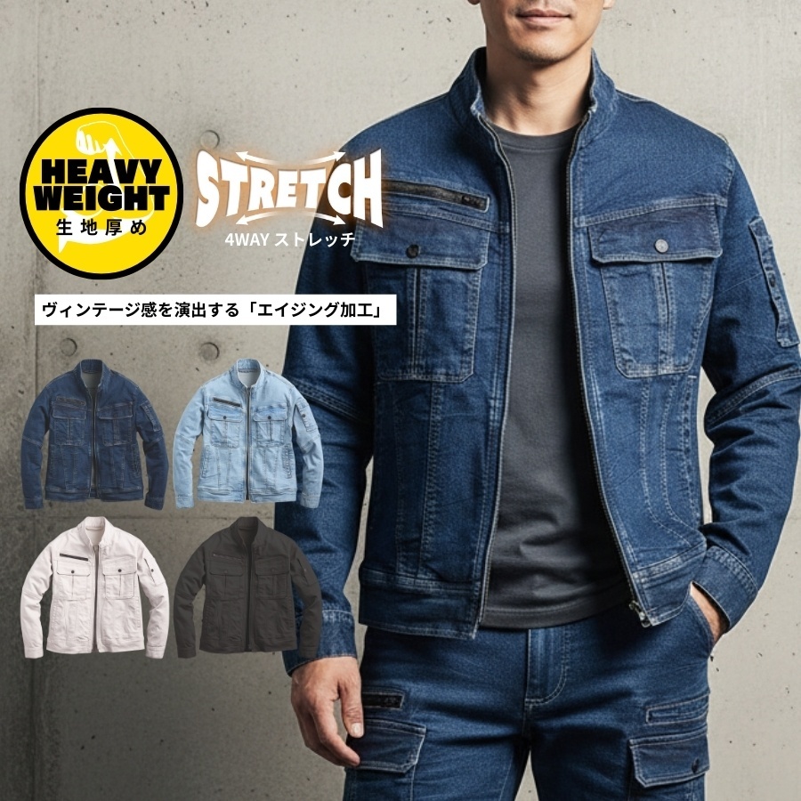 作業着 作業服 デニム ストレッチ かっこいい おしゃれ 上着 ジャケット ブルゾン ヘビーウエイト 02540