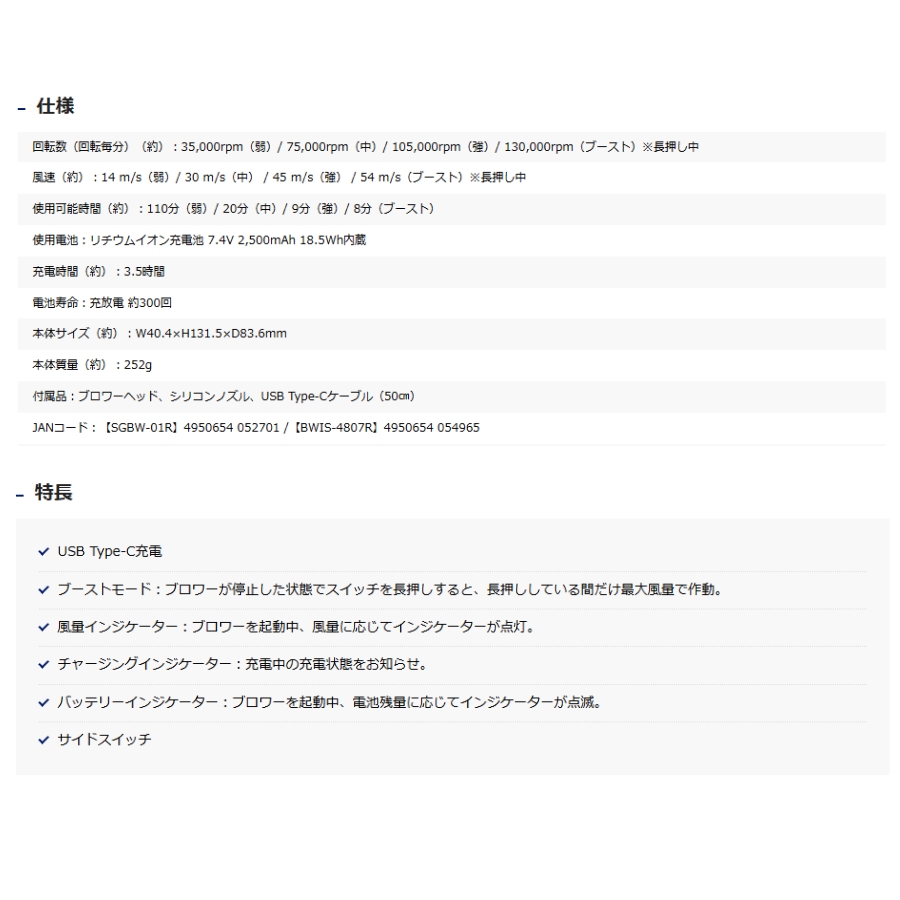 ●付属品:ブロワーヘッド、シリコンノズル、USB Type-Cケーブル(50cm)