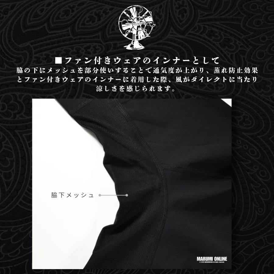 脇の下にメッシュを部分使いすることで通気度が上がり、蒸れ防止効果とファン付きウェアのインナーに着用した際、風がダイレクトに当たり涼しさを感じられます。