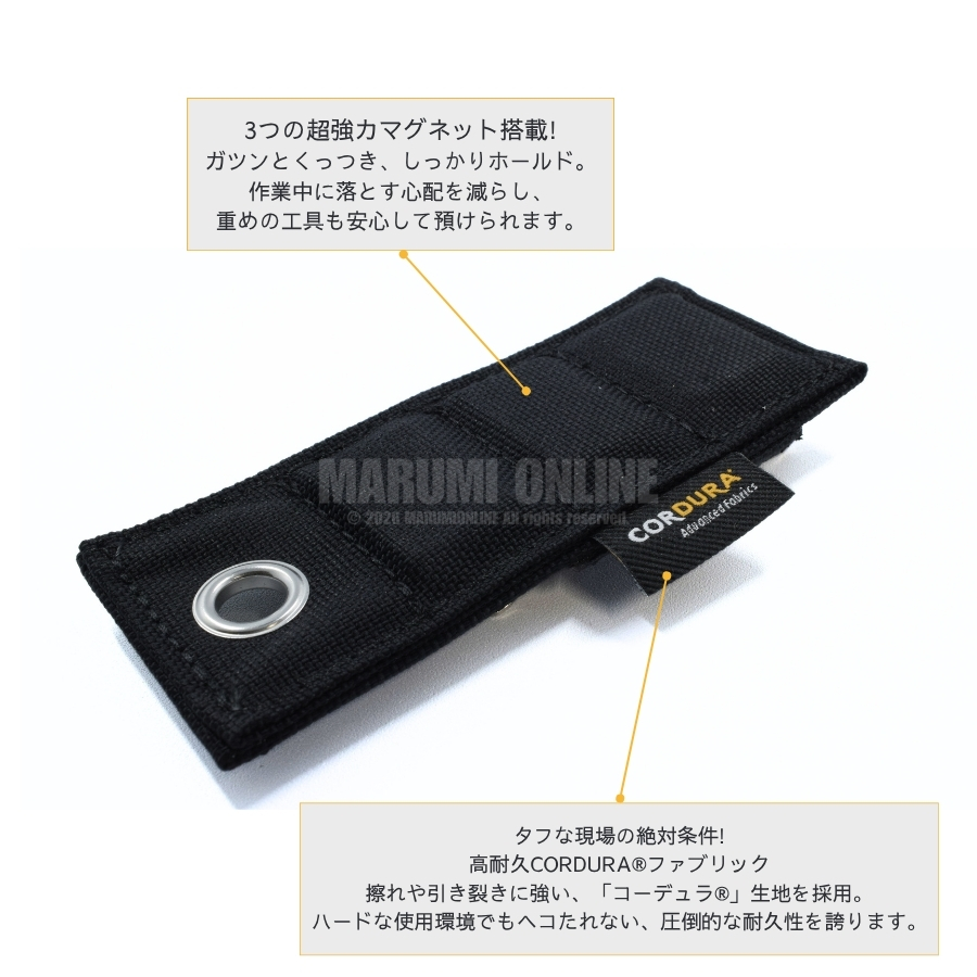ハードな現場使用に対応する、高耐久「コーデュラ」生地を採用したマグネットツールホルダー。擦れや引き裂きに強く、タフな環境でも安心してお使いいただけます。