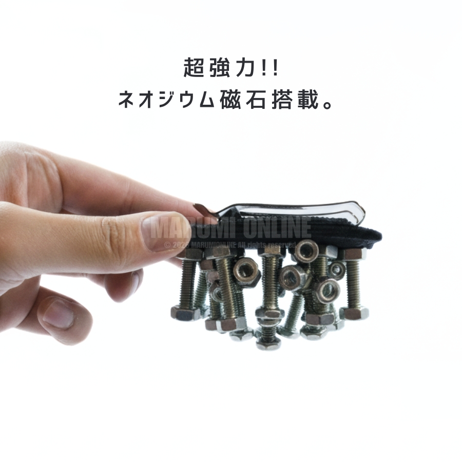 本体内部には強力マグネットを3個搭載。ビス・釘・ビットなどの小物類をしっかり吸着し、作業中の“探す手間”を軽減します。必要な時にサッと取れる高い実用性で、作業効率アップに貢献します。