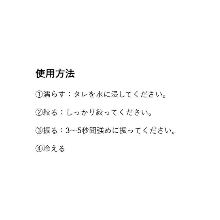 水に浸して振るだけで、独自の気加熱冷却効果により約−10℃の冷感効果が得られます。